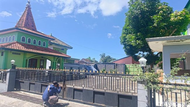 Segel bertuliskan 'garis polisi dilarang melintas' melilit tangkai pintu. Sementara gerbang bagian luar tergembok dengan rantai.