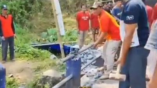 Dalam video berdurasi 1.20 menit itu, tampak sejumlah orang membongkar tembok sisi jembatan. Ini dilakukan agar truk Fuso yang memuat sound system yang melebih kapasitas bisa lewat.
