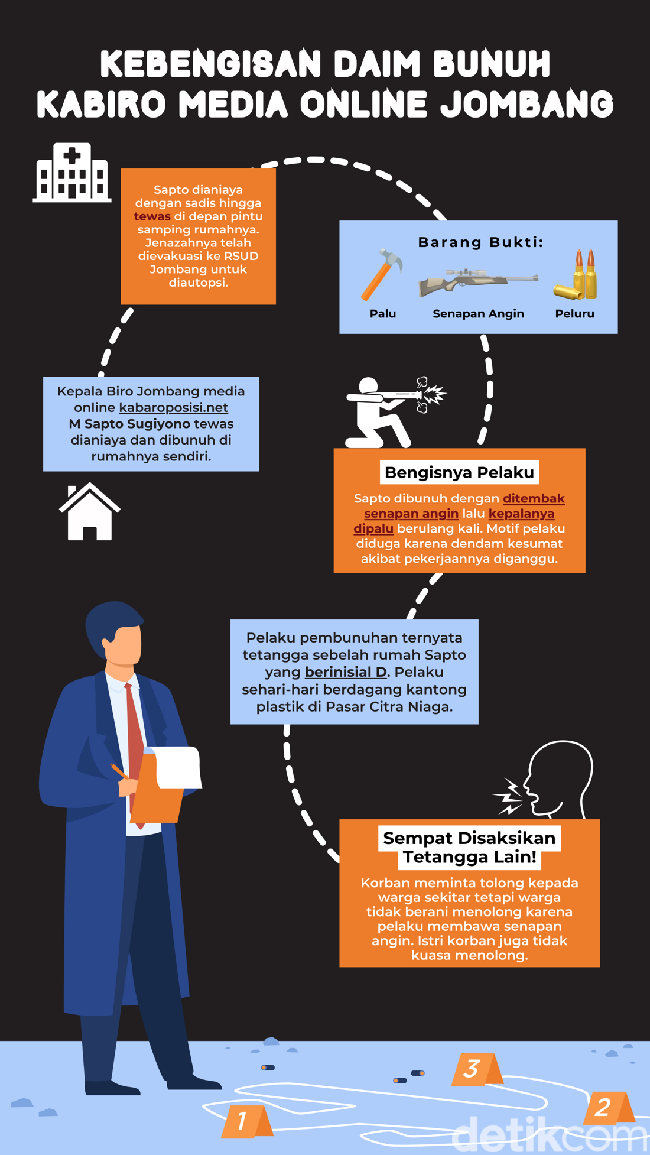 Moch Hasan Syafi'i alias Daim (54) menghabisi nyawa tetangganya M Sapto Sugiyono yang merupakan seorang Kepala Biro (Kabiro) media online Jombang. Daim secara bengis menembak hingga memukul kepala Sapto dengan palu gegara dipicu bara dendam. Begini kebengisan Daim yang disajikan dalam infografis di atas.