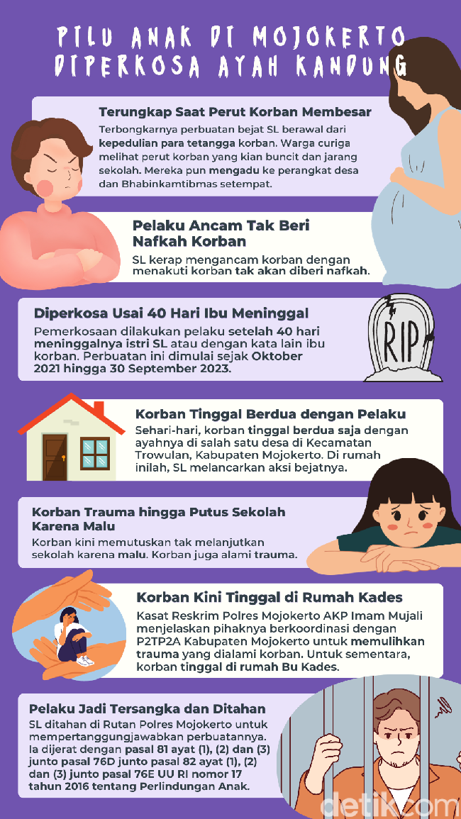 Seorang siswi kelas 2 SMP di Mojokerto diperkosa oleh ayah kandungnya sendiri berinisial SL. Perbuatan bejat itu dilakukan SL setelah 40 hari meninggalnya sang istri. Simak infografis selengkapnya.