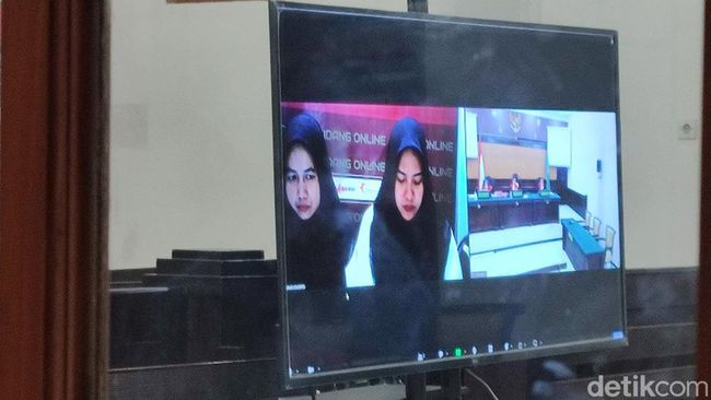 Terdakwa Melania Widiastuti (28), warga Desa Sedati, Ngoro, Mojokerto dan Sulistyani alias Listi (30), warga Desa Sumbergandu, Pilangkenceng, Madiun mengikuti sidang secara daring dari Lapas Kelas IIB Mojokerto.