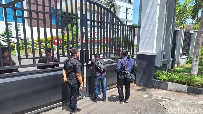 Tampak gerbang kantor ditutup dan dijaga sejumlah petugas satpam. Meski demikian gerbang hanya dibuka sekitar 1 meter. Wartawan yang mencoba masuk dilarang oleh petugas.