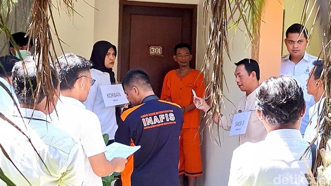 Rekonstruksi diawali saat tersangka mendatangi hotel bintang 3 itu bersama istrinya atau korban Imelda dengan naik motor. Fauzi lantas menuju resepsionis memesan kamar.