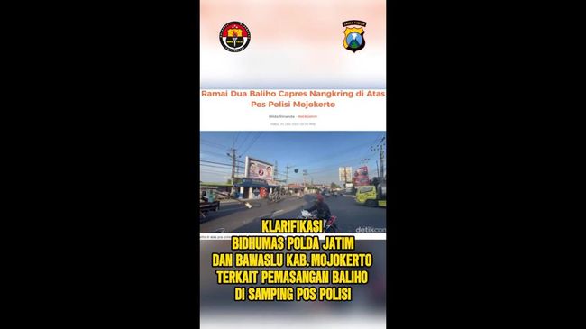 "Halo Sobat Humas! Berikut adalah klarifikasi dari Polda Jatim dan Bawaslu Kab. Mojokerto terkait pemasangan baliho di Pos Polisi. Yuk simak," demikian sebut akun itu dalam caption video yang diunggah.