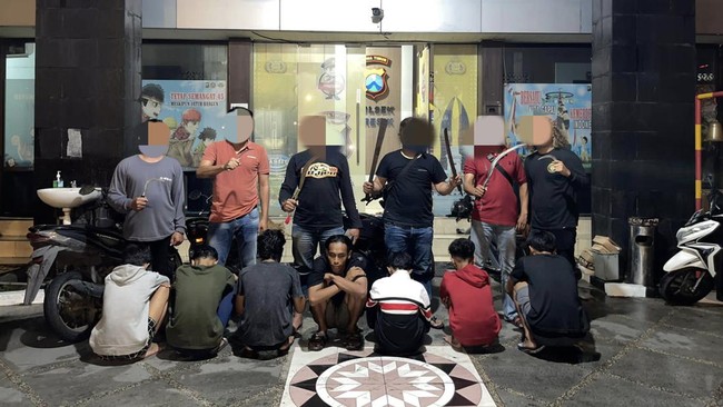 Ada 9 anggota Gangster diamankan usai dibubarkan saat terlibat tawuran di Jalan Sindujoyo, Tlogopojok, Gresik. Polisi meringkus mereka karena ada 1 korban mengalami luka bacok.