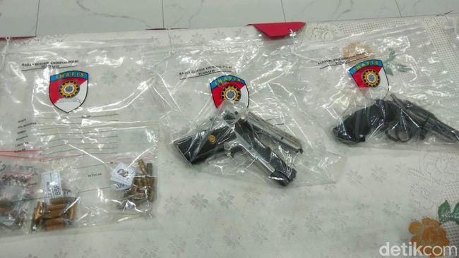 "Kami mengamankan 2 senpi jenis revolver kaliber 38 mm merek S&W dan pistol Colt kaliber 9 mm beserta amunisinya dari tangan para tersangka," ujarnya dalam konferensi pers di Mapolda Jatim, Kamis (11/1/2024).