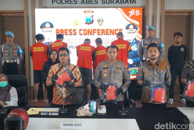"Atas kerja sama Tim Jatanras dan sejumlah pihak terkait, kami amankan 6 oknum tersangka. 3 di antaranya dewasa dan 3 di bawah umur, 4 di antaranya sekolah dan 2 sudah lulus," kata Kasat Reskrim Polrestabes Surabaya AKBP Hendro Sukmono saat konferensi pers di Polrestabes Surabaya, Sabtu (28/1/2024).