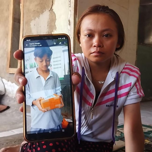 Ibunda Bintang menunjukkan sepatu putih kado terakhir sebelum anaknya tewas dianiaya di Ponpes Al Hanifiyah Kediri. Kerinduan pada Bintang tergambar jelas di mata ibu beranak enam itu, ia terus menatap foto Bintang yang tersenyum ceria di samping kakaknya, Ilham.