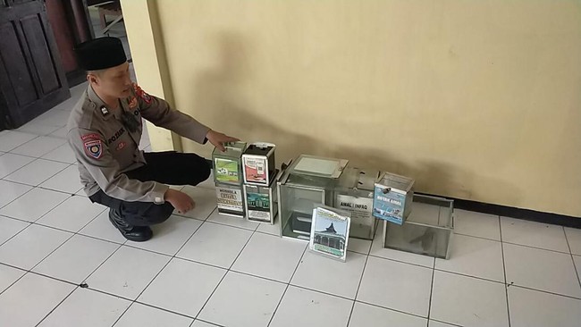 Samsul menyebut, ada sekitar 11 kotak amal yang ditemukan. Seluruh kotak amal ditemukan dalam kondisi kosong dan rusak. Namun, ada sejumlah kotak amal itu masih dilengkapi dengan stiker masjid dan musala.
