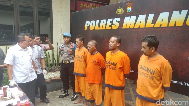 Keempatnya hari ini dihadirkan dalam konferensi pers ungkap kasus perampokan di Mapolres Malang. Tampang para perampok yang telah mengenakan baju tahanan ini diekspose di hadapan kamera wartawan.