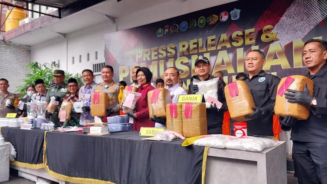 Namun untuk barang bukti yang dimusnahkan tidak secara keseluruhan, terdiri dari sabu seberat 1.506,75 gram, ganja seberat 44.216 gram, ekstasi 319 butir, carnophen 19.000 butir, dan pil koplo dobel L 50.000 butir.