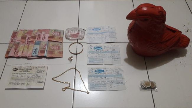 Setelah berada di dalam rumah, lanjut AKP Hasyim, tersangka langsung masuk ke kamar korban dan mengambil dompet berisi 2 kalung emas, 3 lembar surat pembelian perhiasan, 1 gelang kuningan, dan 1 celengan berbentuk ayam berisi uang koin.