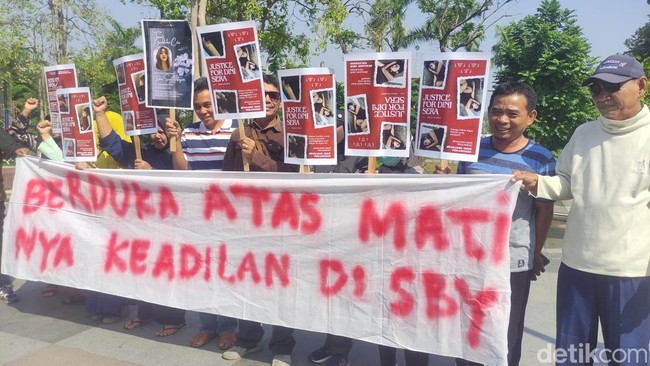 Mereka juga membentangkan poster dengan foto korban yang bertuliskan #JusticeforDiniSera. Serta membentangkan banner dengan tulisan "Berduka Atas Matinya Keadilan di Sby".