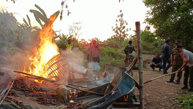 Arena judi sabung ayam di Desa Kedungmaling, Sooko, Mojokerto dibakar polisi. Sebab saat polisi tiba, para pejudi telah kabur.