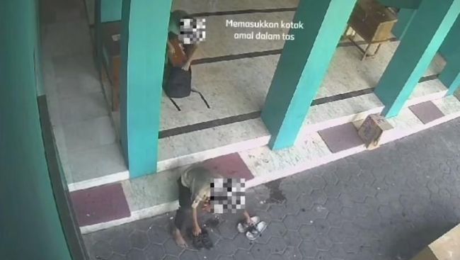 Dalam rekaman CCTV itu terlihat 3 pelajar itu duduk santai di beranda masjid sambil memakan jajan. Tidak berselang lama mereka mulai melancarkan aksinya.