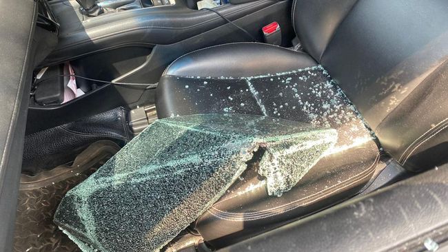 Saat diperiksa, kaca mobil bagian kiri depan dalam keadaan pecah, dan barang berharga di dalam mobil telah hilang.