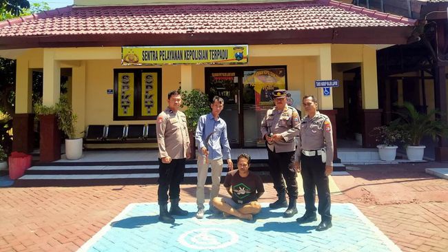 TP (30) hanya bisa tertunduk di halaman Polsek Lakarsantri usai diringkus polisi. Warga Balas Klumprik, Wiyung, Surabaya itu ditangkap karena memukul hingga nyaris membacok tetangganya sekaligus temannya sendiri.