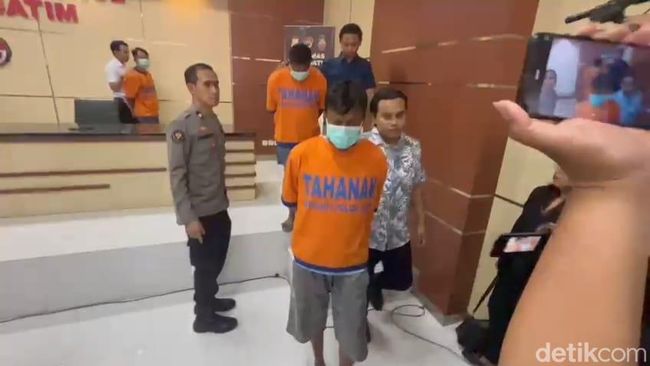 Pantauan detikJatim, ketiganya tampak telah mengenakan pakaian tahanan berwarna oranye dan celana pendek. Sedangkan wajah ditutupi dengan masker medis. Tangan mereka juga tampak diborgol.