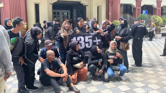Pantauan detikJatim, puluhan keluarga korban tiba di PN Surabaya sekitar pukul 09.00 WIB. Tampak mereka mengenakan pakaian serba hitam dan banner bertuliskan Usut Tuntas Tragedi Kanjuruhan.