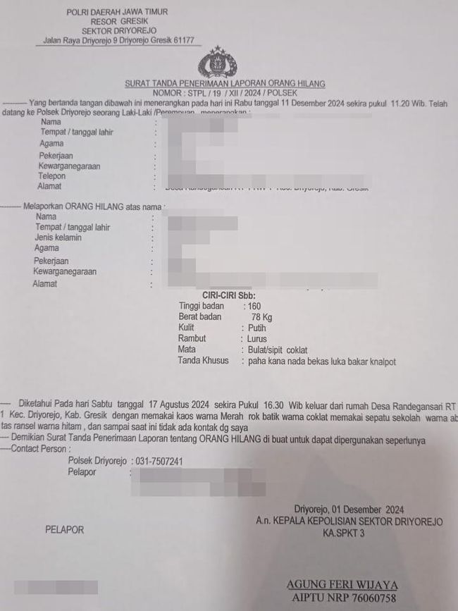 Mengenai laporan orang hilang yang dilakukan MNR, detikJatim mengklarifikasi dari sumber kepolisian. Ternyata MNR baru melaporkan istrinya hilang ke Polsek Driyorejo, Gresik pada 1 Desember 2024.