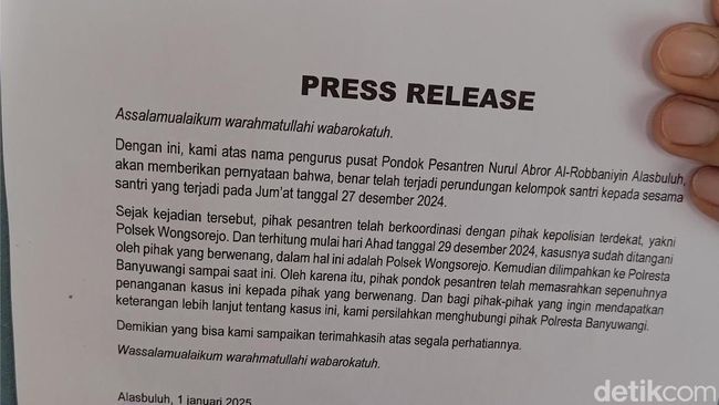 "Kami tidak bisa memberikan foto dan video, hanya pers rilis ini sebagai statement kami," kata Suyono, Pengurus Santri di Ponpes Nurul Abror Al-Robbaniyin Alasbuluh kepada wartawan, Kamis (2/1/2025).