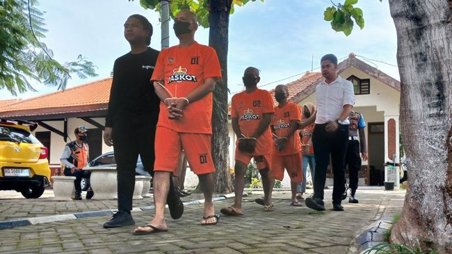 Para tersangka dipamerkan kepada awak media di depan Gedung Gradhika Bakti Praja, Kota Pasuruan, Senin (3/2/2025).