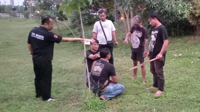 Polisi saat sudah mengamankan empat pemuda yang diduga terlibat pengeroyokan. Mereka YAP (28), warga Kecamatan Lengkong, Kabupaten Nganjuk; AEP (29), warga Desa Sumberejo, Kecamatan Gempol, Kabupaten Pasuruan; ME (30) Lampung Utara; dan MIR (18) asal Kecamatan Candi, Kabupaten Sidoarjo.