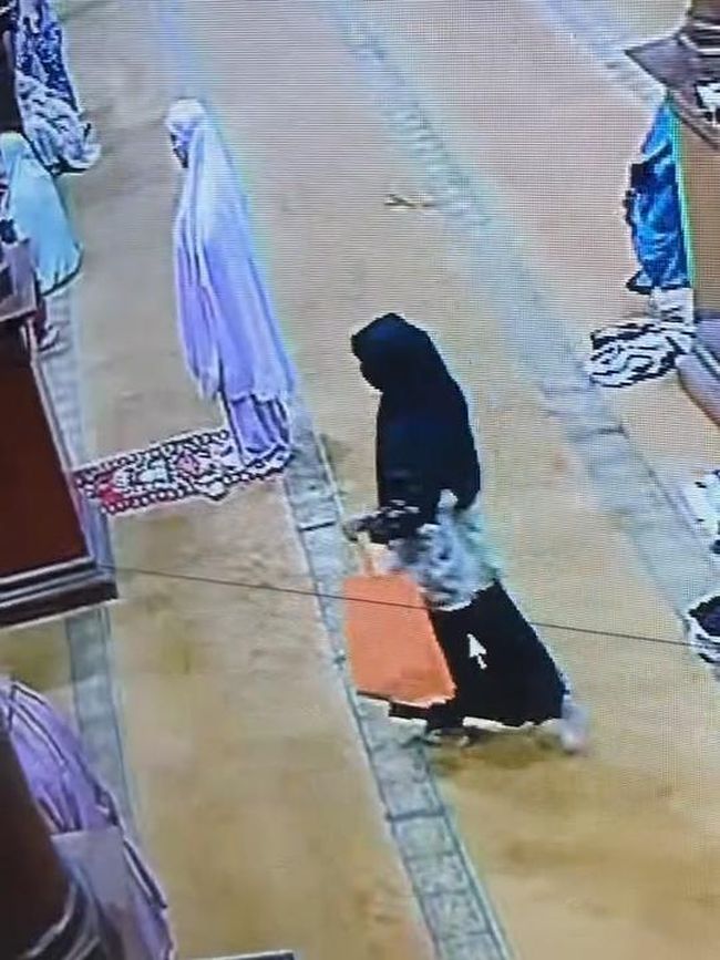 Dalam rekaman CCTV, pelaku yang memakai baju batik warna biru serta berjilbab dan mengenakan masker datang dan langsung duduk di dekat pilar masjid.