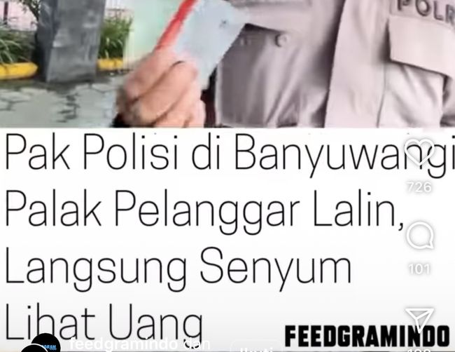 Beredar di sejumlah akun media sosial Instagram dan TikTok, seorang anggota Sabhara Polresta Banyuwangi diduga melakukan pungutan liar (pungli) terhadap pengguna jalan yang terbukti melakukan pelanggaran.