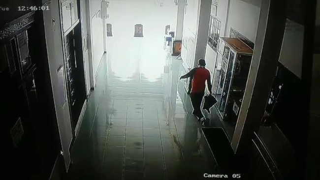 Dengan tenang, pria berbaju merah itu masuk ke halaman masjid yang sepi. Pria bertopi selanjutnya memarkir motor di halaman masjid lalu masuk ke area dalam untuk beraksi.