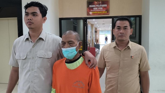 Pantauan detikJatim, S digelandang polisi dari ruangan Unit PPA Sat Reskrim Polres Gresik menuju Rumah Tahanan. Ia memakai baju oranye bertuliskan Tahanan Polres Gresik lengkap dengan masker menutupi sebagian wajahnya yang mulai keriput karena lanjut usia.