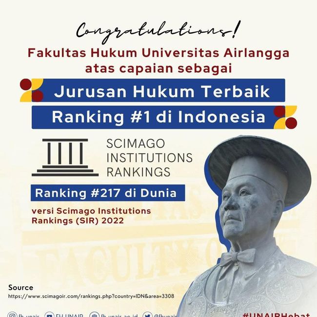Fakultas Hukum Universitas Airlangga (FH Unair) kembali torehkan prestasi. Kali ini, FH Unair menempati rangking 1 di Indonesia berdasar penilaian Scimago Institutions Rankings (SIR) 2022 dan QS World University Ranking by Subject Law 2022.