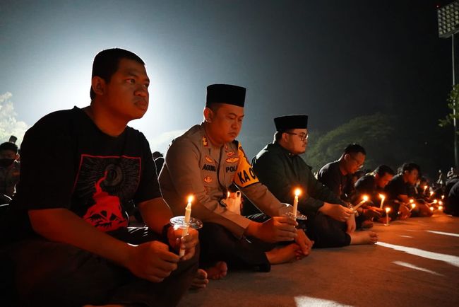 Bupati Kediri Hanindhito Himawan Pramana bersama Kapolres Kediri AKBP Agung Setyo Nugroho menggelar doa bersama untuk korban tragedi Kanjuruhan, Malang. Kegiatan yang digelar di Stadion Canda Bhirawa Pare pada Senin (3/10) malam itu turut diikuti oleh para suporter Persedikab dan Persik Kediri.