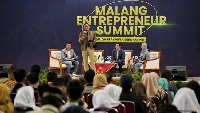 Menteri Pariwisata dan Ekonomi Kreatif (Menparekraf) Sandiaga Uno menjadi pembicara dalam seminar Malang Entrepreneur Summit 'Muda Berkarya Berdampak'. Pada kesempatan itu, ia mendorong para pelajar agar menjadi entrepreneur demi memajukan ekonomi Indonesia di masa mendatang.