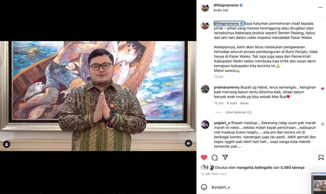 "Saya Hanindhito Himawan Pramana secara pribadi mohon maaf sebesar-besarnya kepada pihak-pihak yang merasa tersinggung ataupun dirugikan, karena pada saat sidak Pasar Wates kemarin ada beberapa produk atau bahan bangunan yang terucap dari mulut saya seperti Semen Padang, Aplus dan lain-lain," kata Dhito dalam video yang dikutip dari instagram pribadinya @dhitopramono pada Rabu, (26/10/2022).