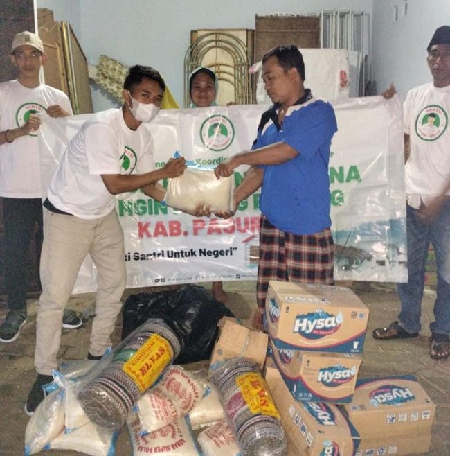Relawan Santri Dukung Ganjar (SDG) memberikan bantuan untuk korban bencana alam angin puting beliung di Dusun Montok, Desa Candibinangun, Kecamatan Sukorejo, Kabupaten Pasuruan, Jawa Timur, Rabu (26/10). Bantuan secara simbolis diberikan tim relawan SDG Jawa Timur kepada Kepala Desa Candibinangun.