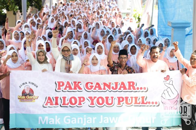 Emak-emak dari berbagai daerah di Kabupaten Lamongan, Jawa Timur berkumpul untuk mendukung Ganjar Pranowo menjadi Presiden di 2024. Mereka tergabung dalam jaringan relawan Mak Ganjar Jawa Timur.