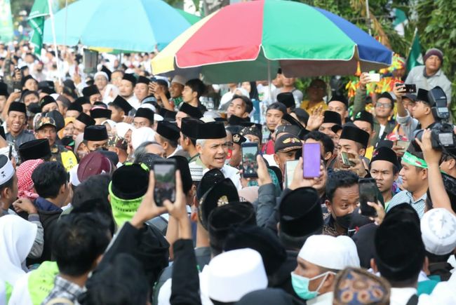 "Pak Ganjar Presiden, minta selfie Pak," suara salah satu nahdliyin sambil mencoba meraih Ganjar.
