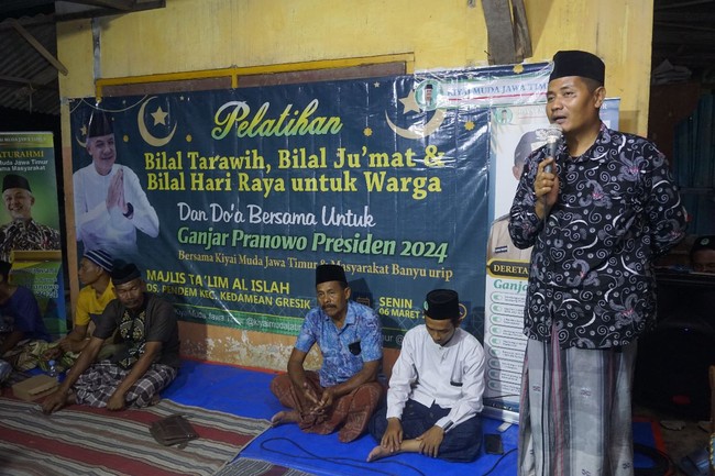Kelompok sukarelawan Kiai Muda Dukung Ganjar Jawa Timur (Jatim) menggelar pelatihan bilal Salat Jumat, Tarawih, Idul Fitri, dan Idul Adha. Kegiatan itu digelar bersama Majelis Taklim Al Islah di Dusun Pendem, Desa Banyu Urip, Kecamatan Kedamean, Gresik, Jatim, Rabu (8/3/2023).