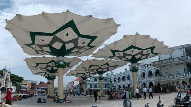 Satu payung Madinah terletak di sisi paling utara sebelah barat bersebelahan dengan bangunan khusus jamaah wanita Masjid Agung Al Anwar, sempat gagal mengembang, Kamis (6/4/2023) malam. Warga menyebut payung gagal mengembang salah satu ujung jari-jarinya tersangkut tembok lantai dua.