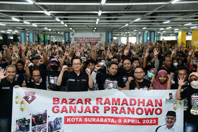 Relawan Ganjar Pranowo yang tergabung dalam Sahabat ganjar mengadakan Bazar Ramadan di Kota Surabaya, Jawa Timur, Minggu (9/4). Bazar tersebut menyuguhkan beragam dagangan seperti peralatan dapur, perkakas, hingga makanan dan minuman.