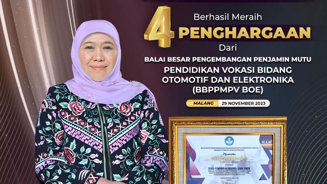 Pemprov Jatim melalui Dinas Pendidikan Provinsi Jatim berhasil memborong empat penghargaan sekaligus. Penghargaan itu datang dari Balai Besar Pengembangan Penjaminan Mutu Pendidikan Vokasi (BBPPMPV) Bidang Otomotif dan Elektronika (BOE).