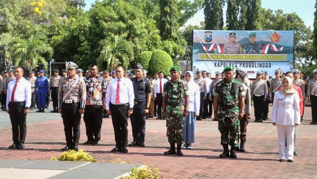Kapolres Probolinggo AKBP M Wahyudin Latif, bersama Dandim 0820/Probolinggo yang diwakili Kasdim Mayor Inf Herawadi Kurnawan memimpin apel sinergitas TNI dan Polri di Lapangan Apel Mapolres Probolinggo pada Senin (29/9/2025).