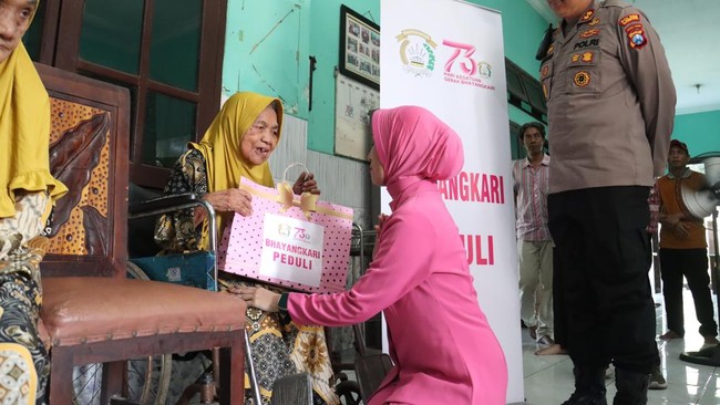 Peringatan Hari Kesatuan Gerak Bhayangkari (HKGB) ke-73 diisi dengan bakti sosial ke Rumah Peduli Lansia (RPL) di Kota Mojokerto. Momen penuh kehangatan tercipta ketika para istri polisi bercengkerama dengan lansia sembari menyerahkan bantuan.