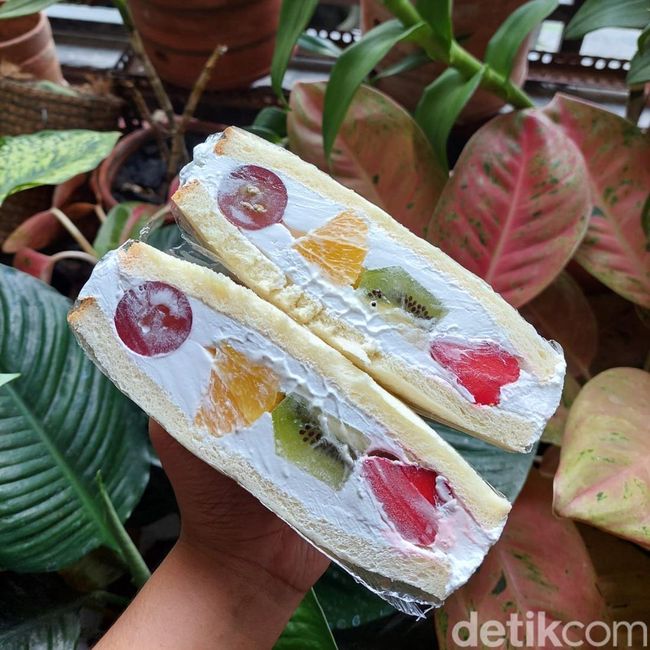 Namanya fruits sando alias sandwich buah. Dari namanya saja, sudah terbayang jika camilan ini merupakan gabungan antara roti lapis yang diisi dengan potongan buah segar.