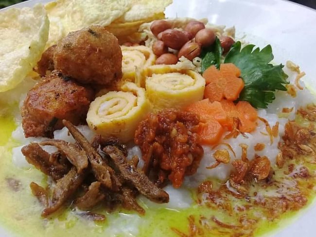 Cita rasa bubur ini dikenal gurih dengan aneka topping. Seperti telur dadar, ayam, perkedel kentang, dan kering tempe.