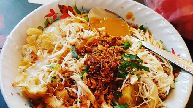 Bubur ayam dilengkapi dengan sejumlah topping, di antaranya suwiran daging ayam, potongan cakwe, kacang, hingga kerupuk. Tidak lupa dilengkapi sambal.