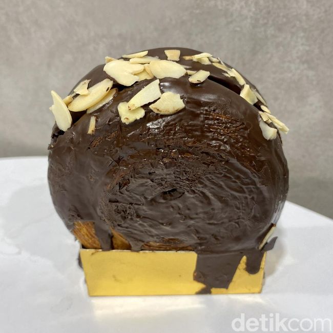 Akhirnya, perburuan detikJatim membuahkan hasil saat datang ke Komugi Boulangerie, salah satu bake house pastry terkenal di Surabaya. detikJatim pun mencoba cromboloni dengan varian cokelat yang ditaburi toping almond di atasnya.