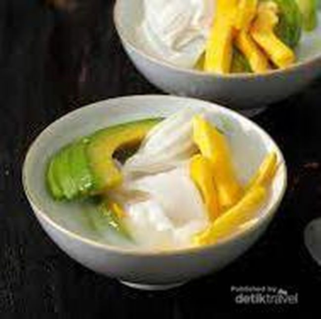 Tambahkan serutan agar-agar kelapa muda, buah nangka dan buah alpukat di atasnya.