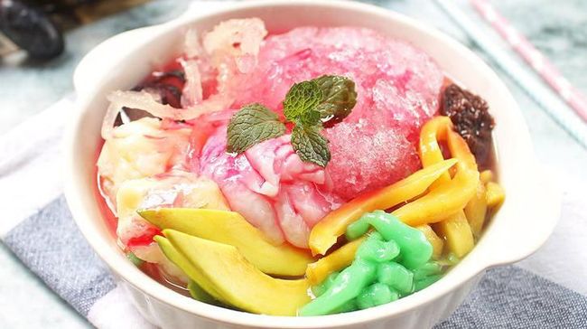 - Larutkan gula pasir dengan air hangat, sisihkan. Belah buah blewah, hilangkan bijinya kemudian cuci bersih. Serut buah blewah di atas mangkok es.